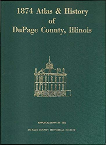 1874 Atlas of DuPage County. Appr 9-1/4″x 12- 1/4″x 7/16″ hard cover, 124 pp. reduced size repro of 1874 Atlas & History of DuPage County first published in 1874. Full of Township and community maps, narrative sketches of early settlers and their families, and drawings of many residence and business properties. Reprinted in 2003. $29
